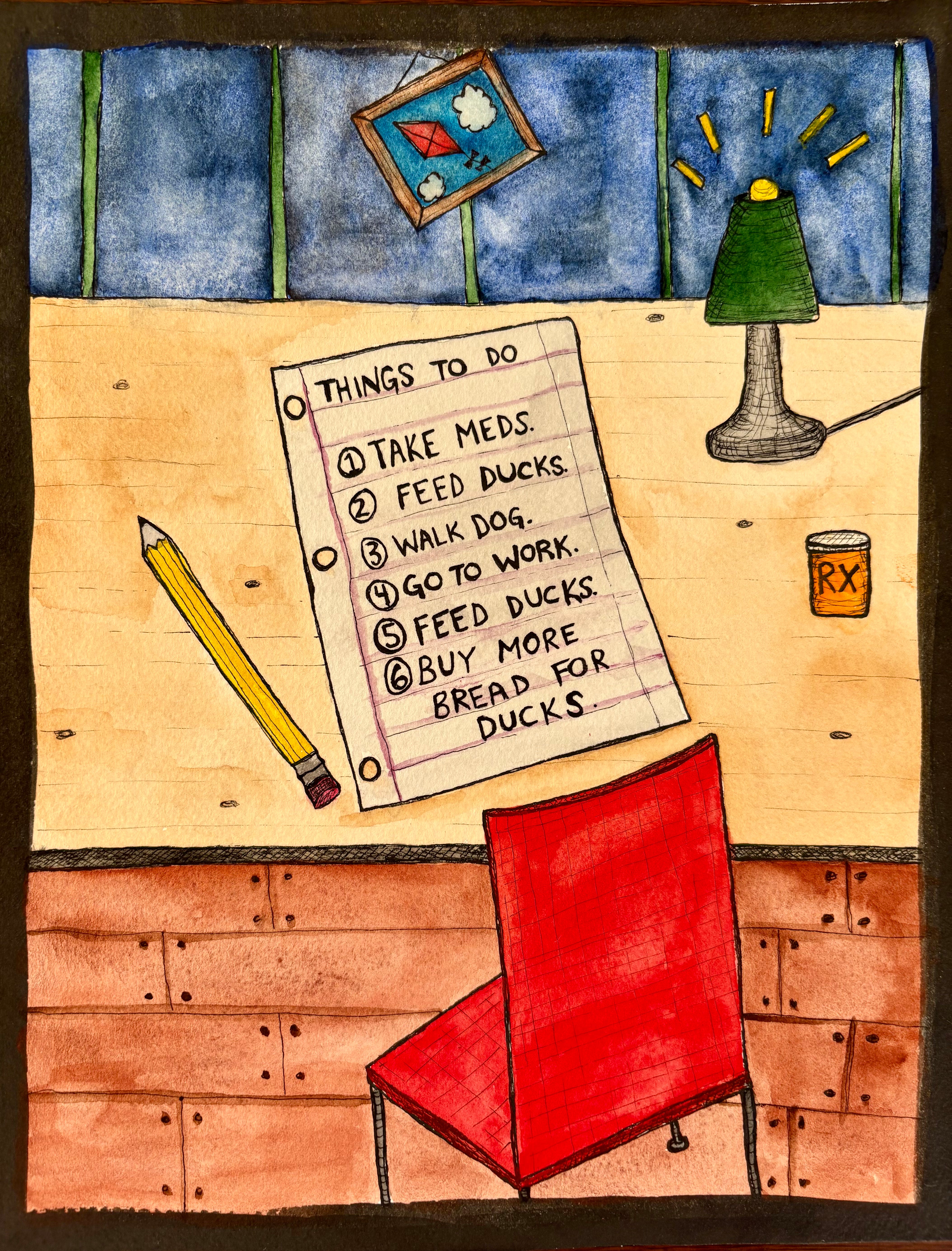 I think the first [binder paper painting] came about as a painting inside a painting. You can see it as the list of things to do: feed ducks, take meds, etc. This was from that illustrated novel I never finished called The Crumb People.