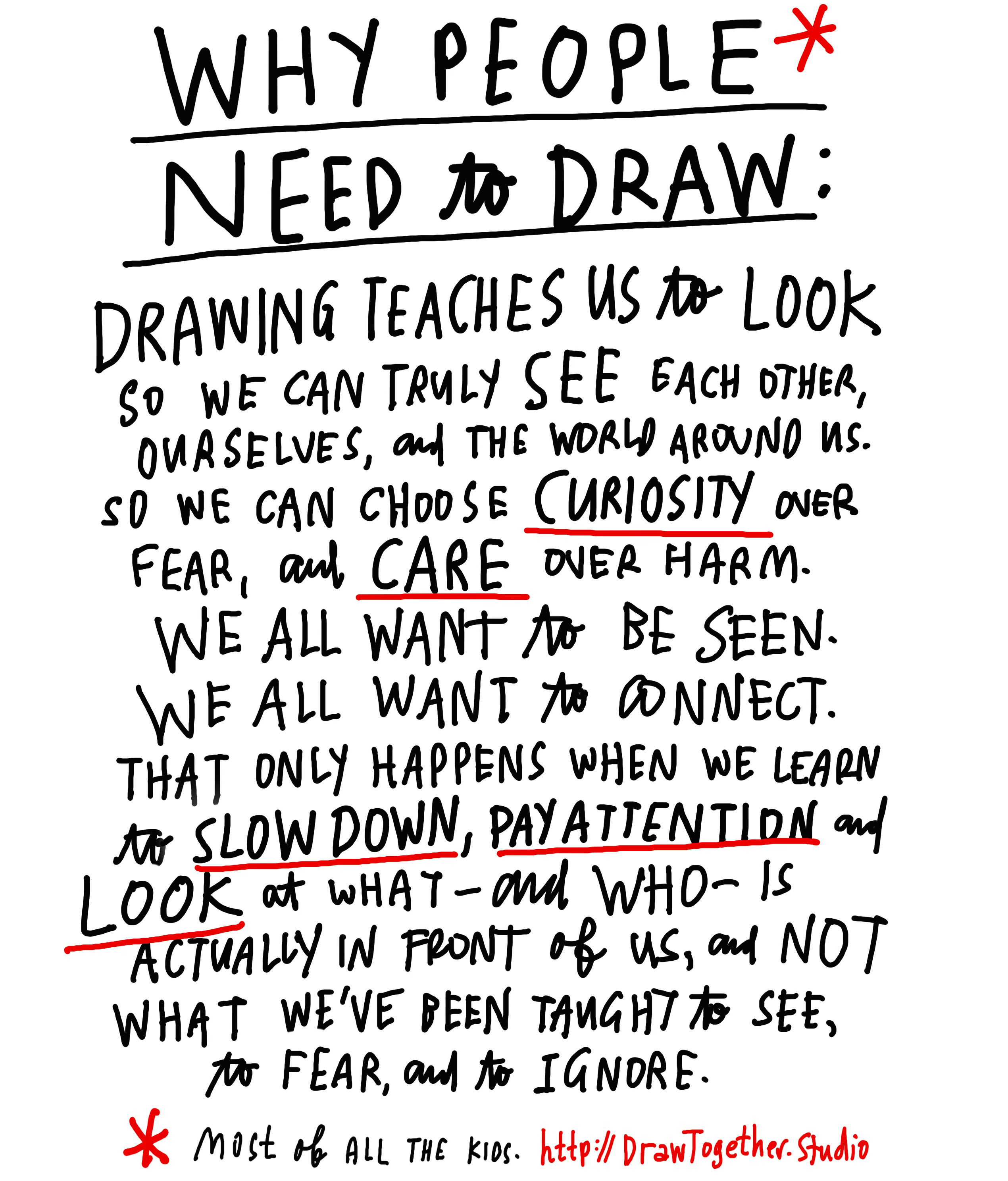 Before we dive into today’s lesson and assignment, I want to take a moment to acknowledge what’s happening in the U.S. and around the world right now. This is a very scary time, full of fear, uncertainty, and attacks on human rights. I was talking with a friend a couple days ago about the threats facing our neighbors, our friends, our families, and ourselves. In desperation, I asked, “What can we do?” She snapped back, “Your GUT community is doing it! Get people to draw and see each other.” In challenging times, it’s helpful to be reminded of our deeper purpose. So this feels like a good time to share my/DrawTogether’s mission again — a reminder to you, the whole DrawTogether community, and myself. There is more direct action, too. But this is a very solid foundation for change: