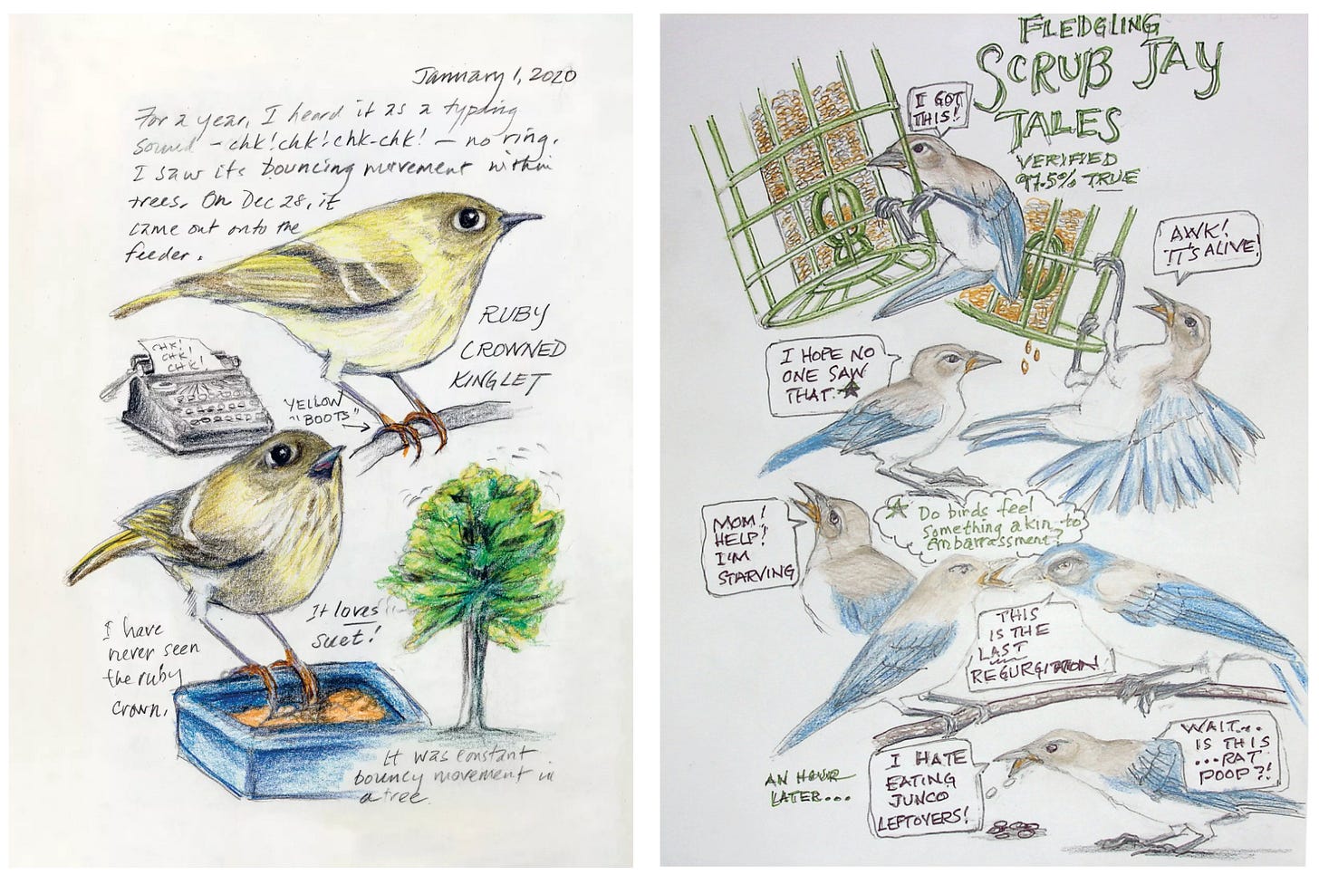 During the pandemic, Amy began noticing the birds in her backyard. Inspired by Jack’s work, she began watching, sketching, and writing about birds behaviors, personalities, and relationships.