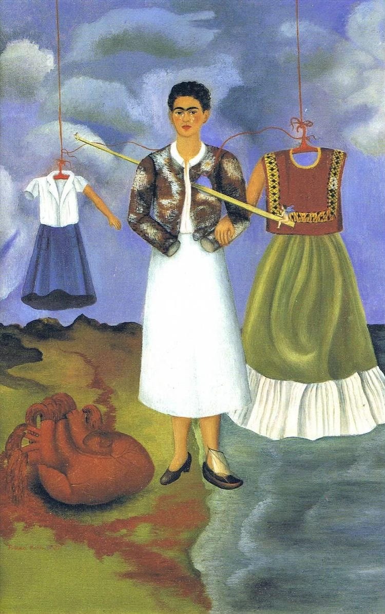 Another artist whose work included clothing as a theme was Frida Kahlo. Her self-portraits were often highly narrative. They told a story. In the 1937 painting below, titled Memory, The Heart, the three outfits represent three aspects of her identity: the western clothes she’s wearing, a schoolgirl outfit, and a traditional Tehuana costume.