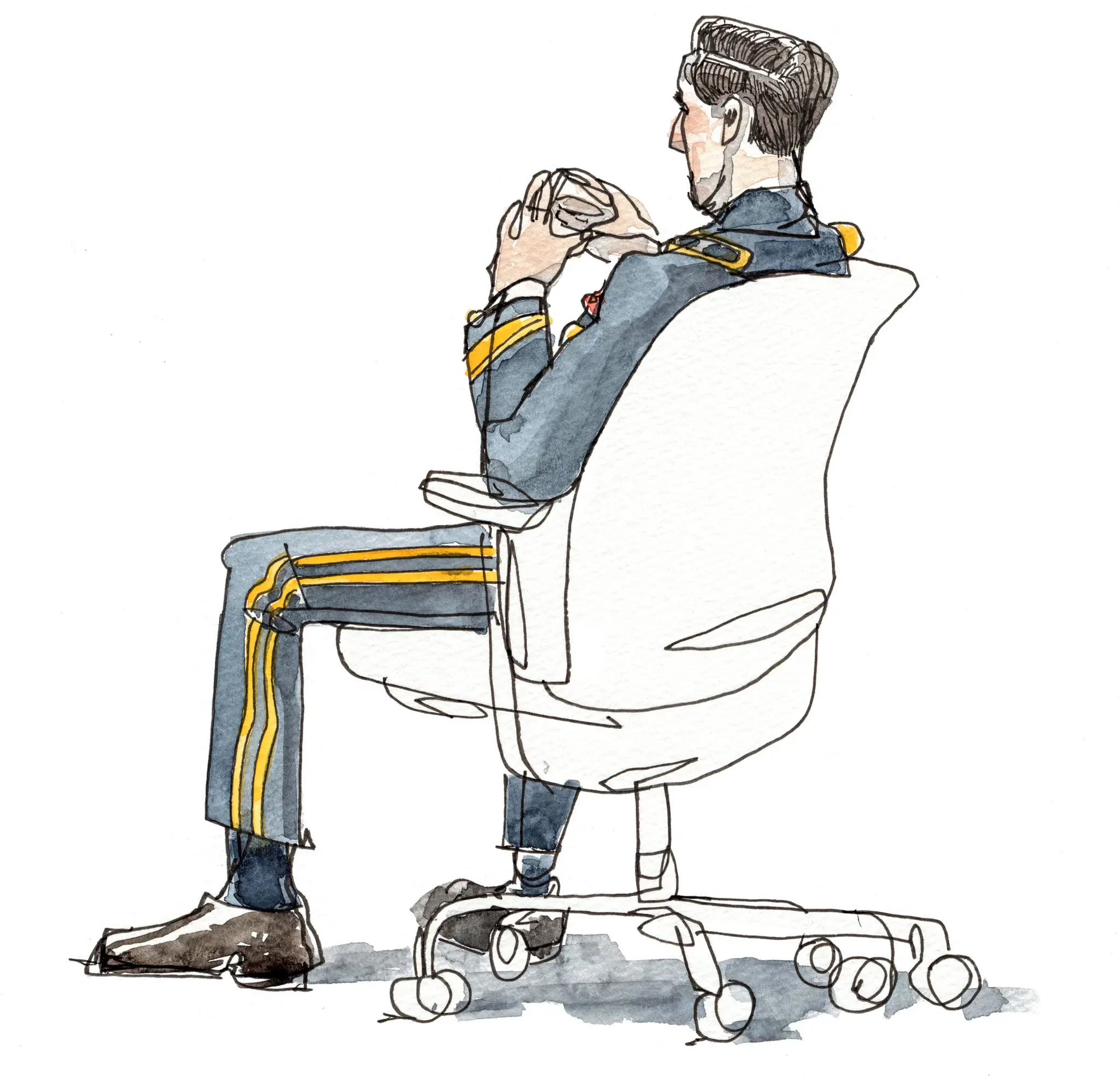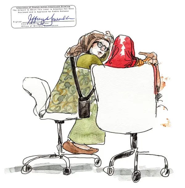 Clothing can be light or heavy—and I don’t mean just the materials. Several years ago I had the opportunity to travel to Guantanamo Bay for the New York Times. I was only the fifth artist allowed on the base and in the courtrooms (no photographers allowed, only drawers!) The NYT sent me to document the culture of the courtroom. Specifically, I was there to draw the clothing the detainees and lawyers wore and depict how they wore them — their postures, interactions, and general performance in the courtroom.