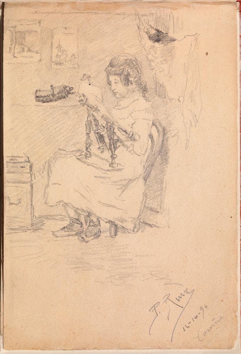 We develop our lines — handwriting and drawing, both — through thousands of hours of practice. Not effortful, deliberate practice, but simply by doing — again and again and again. When I look at Picasso’s paintings, as distinctive and recognizable as Einstein’s hair, I now understand how he got there: it was through those tens of thousands of drawings he made in those sketchbooks. That’s how you develop such a confident, loose line. Practice practice practice.