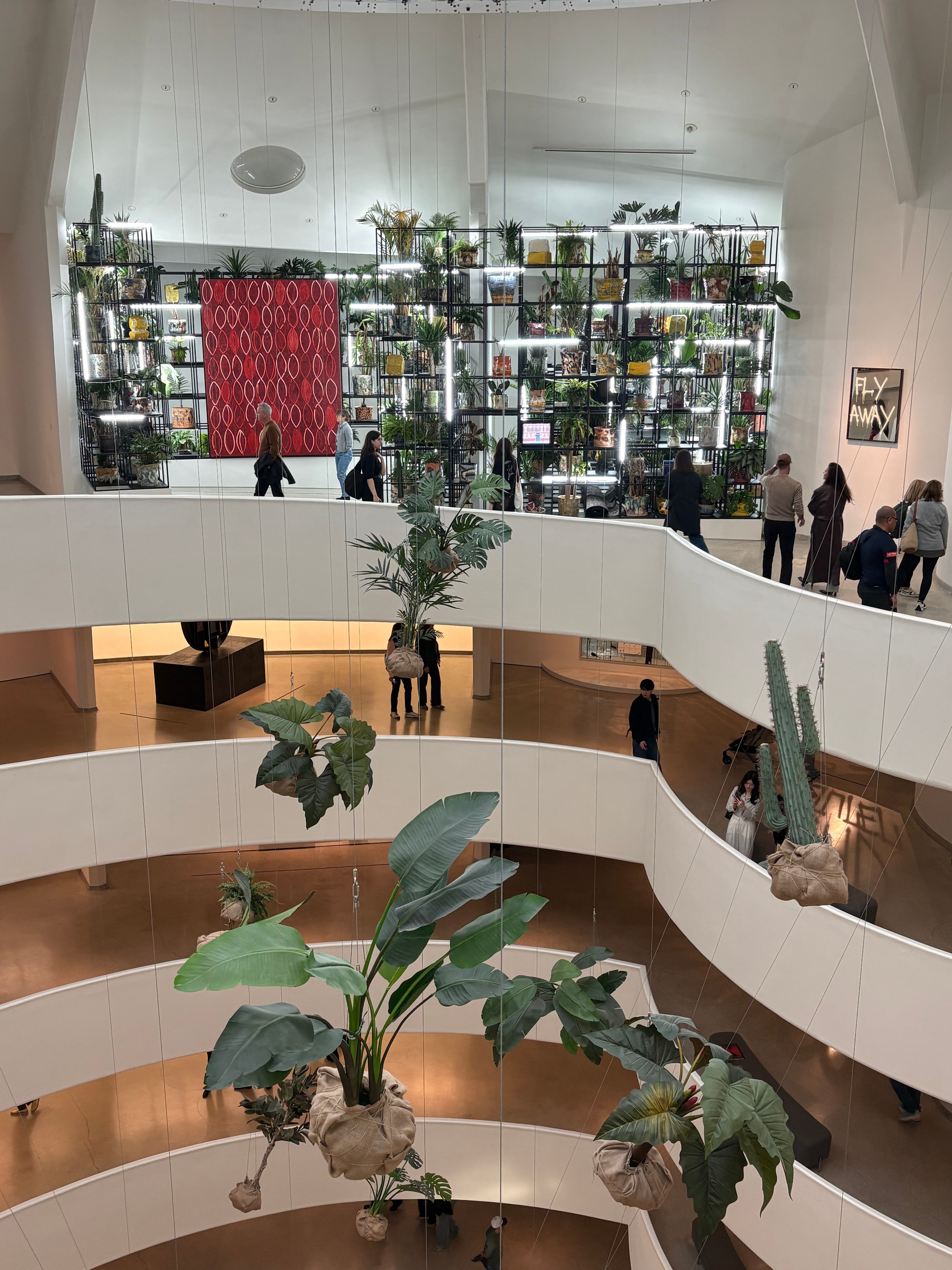Rashid Johnson is a conceptual artist just a year or two younger than me. He works in photography, sculpture, installation, video, painting, you name it. I love how he moves from medium to medium to explore and question. The whole museum is filled with his work, including the building’s vertical atrium, where plants hang on cables, frozen in time, falling, flying, circling in space. Also, in the photo below you can see the giant grid of artifacts that constitute a collection of stories and thoughts and feelings in the form of objects, which is kind of like standing in the middle of the artist’s brain and history.