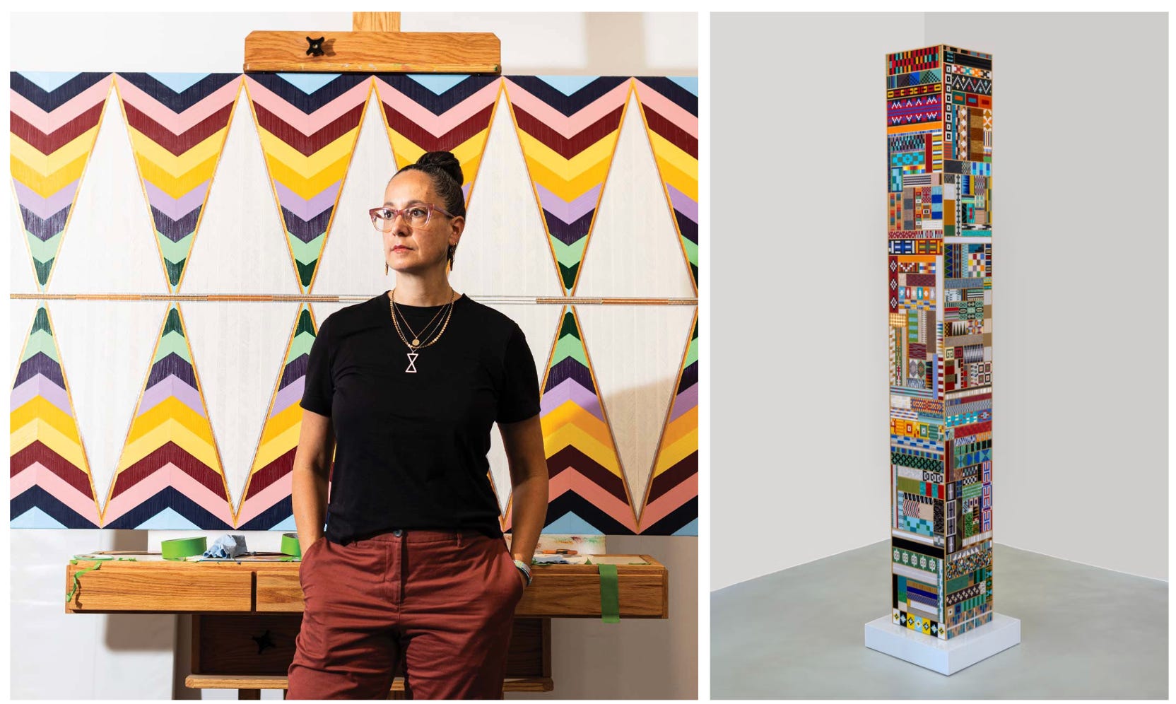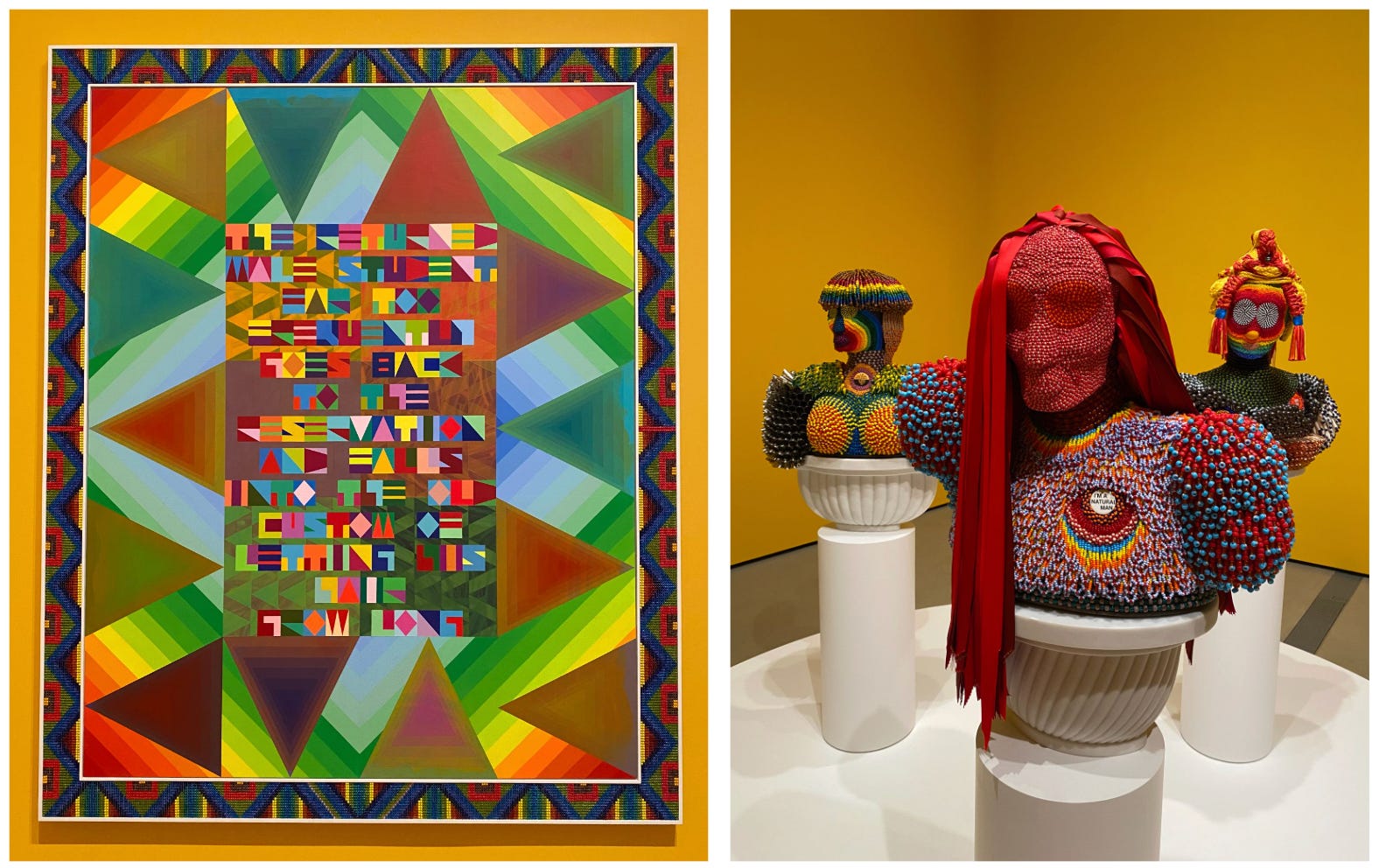 Jeffrey Gibson draws upon his Indigenous heritage, Queer identity, American and global history, as well as pop culture, to create vibrant paintings, sculptures, and videos. Even as he addresses painful histories of oppression, there is a pride and joy that emanates from his colorful work — an insistence on recognizing the resourcefulness and resilience of Indigenous and other marginalized peoples. In 2024, Jeffrey was the first Indigenous artist to represent the United States with a solo show at the Venice Biennale, and those works were recently on view at the Broad in Los Angeles. In the room above, ancestral figures with beaded text referring to Reconstruction and legislation affecting the civil rights of Black and Indigenous Americans flanked a quotation from Martin Luther King, Jr., advocating for us to see ourselves in relation to history and our own agency.