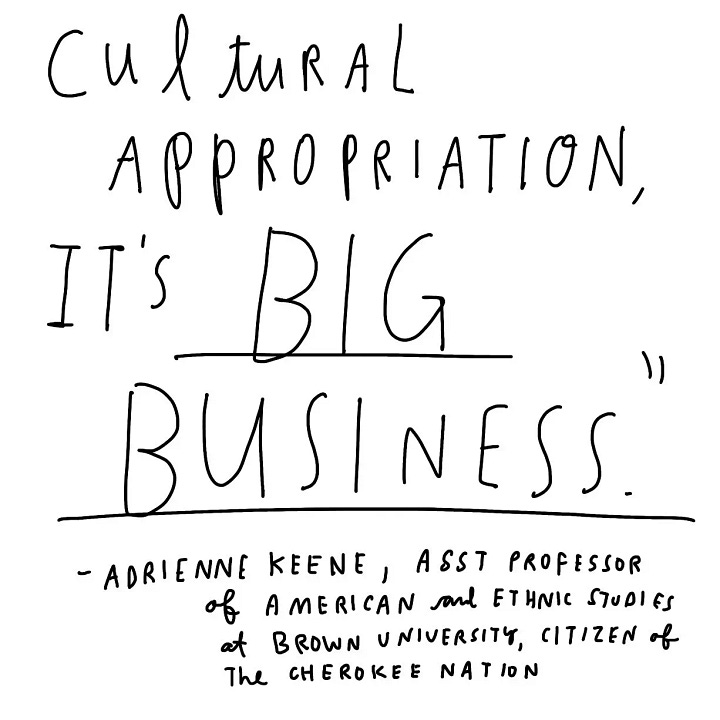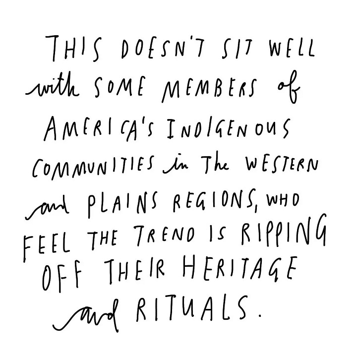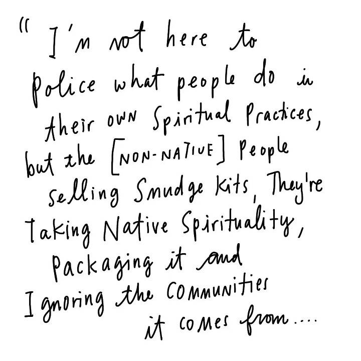 Several years ago, I did a piece for the New York Times about the sharp increase in popularity of white sage as the Native practice of smudging became more widely practiced, especially by white people. I was interested in how Native folks felt about it, so I reached out to Adrienne Keene, a citizen of the Cherokee Nation, visual artist, and former professor at Brown University, to ask her take. This was her valuable response: