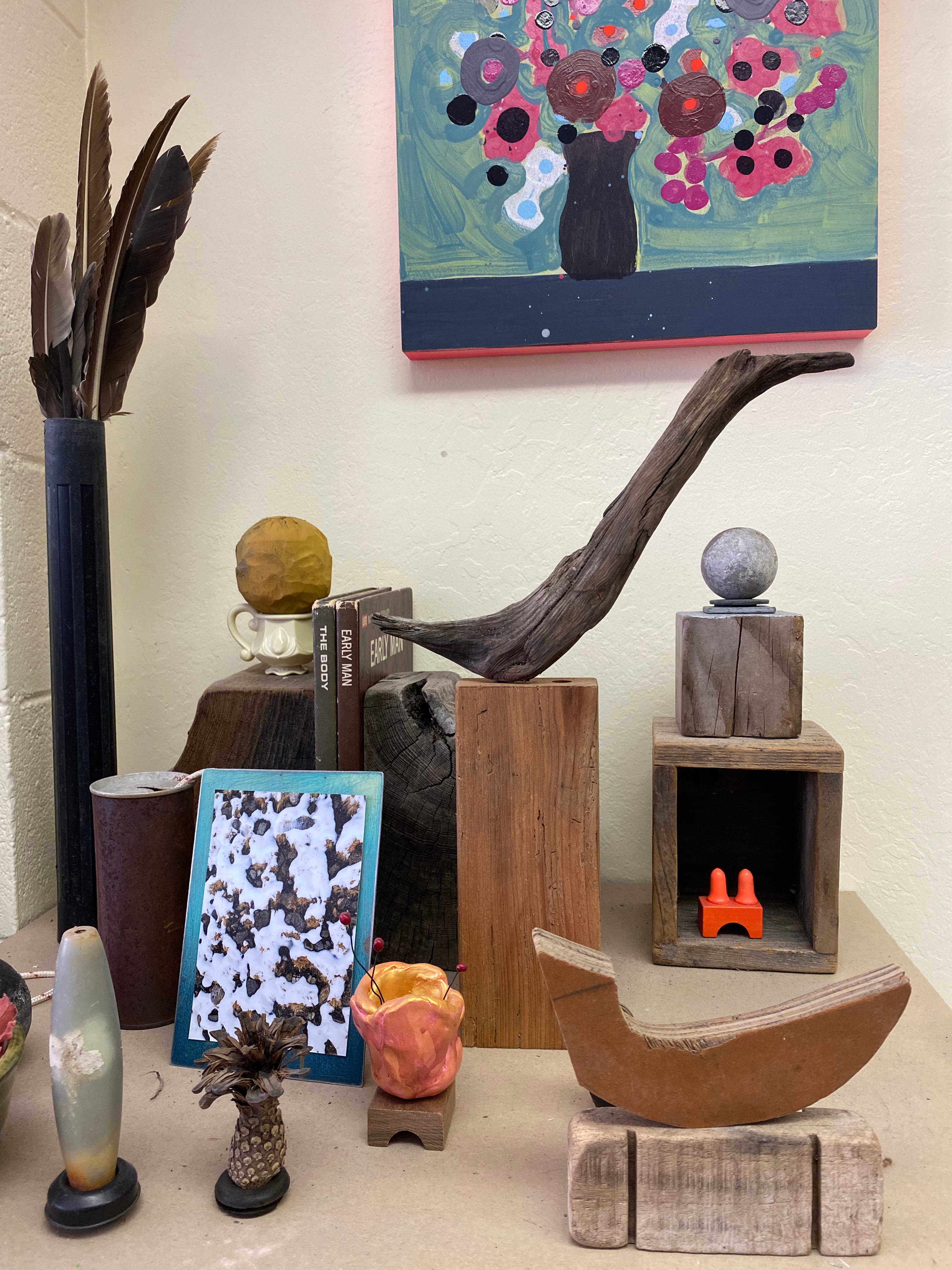 In addition to drawing and painting, Tucker makes sculptures using found objects. Sort of 3D versions of his painting, his sculptures are simple but contain an incredible sense of color and shape and scale and silliness. Each offers a little loving attention to the world.