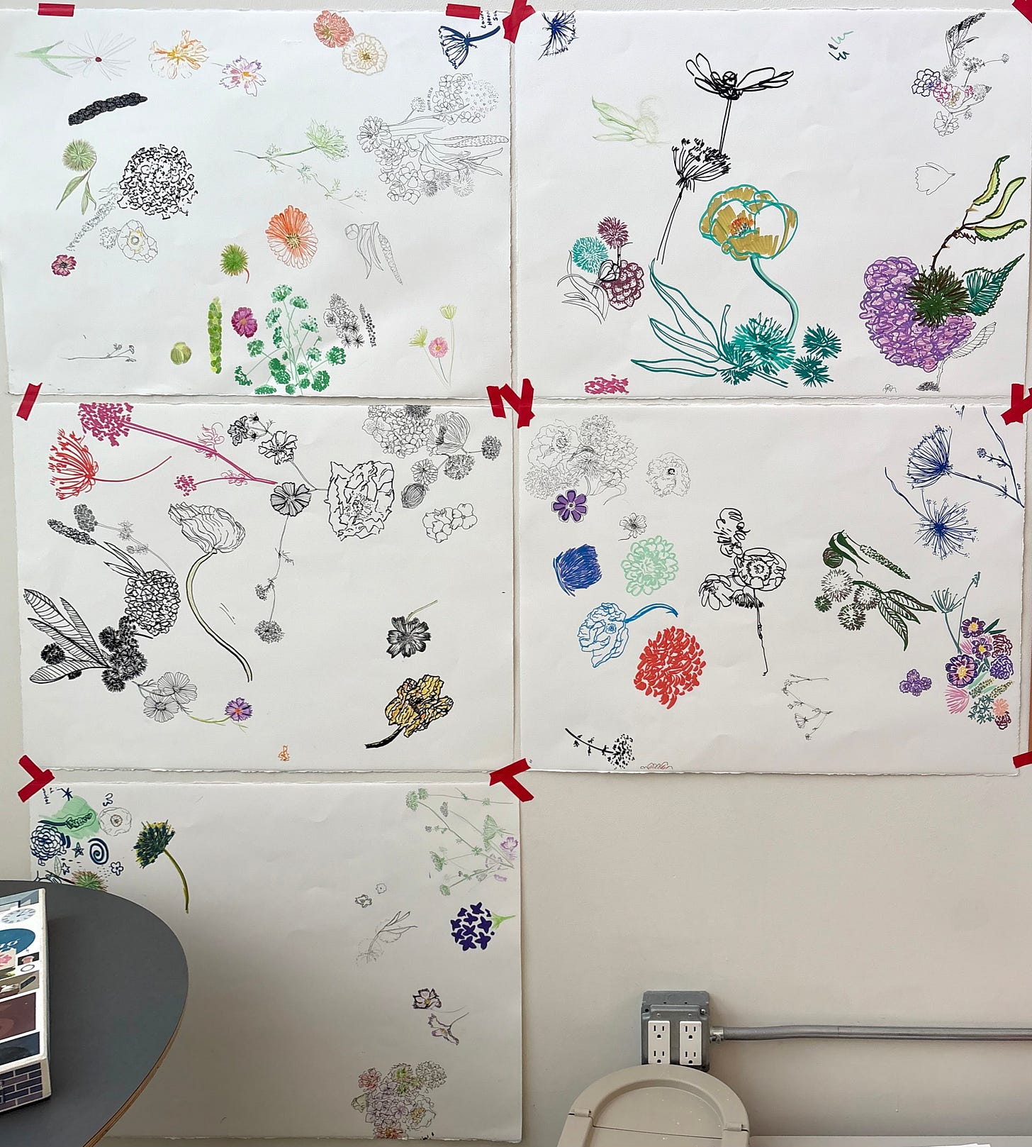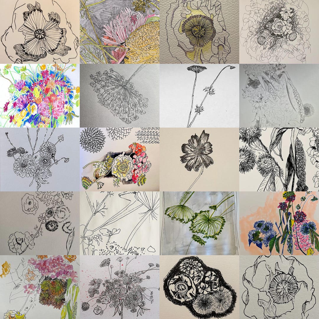 A great example of creative action is our gathering at SFMOMA to draw together and honor the work and community/creative practices of Ruth Asawa. We met, connected, and drew flowers together, including a giant 5 panel collaborative drawing based on a giant, gorgeous arrangement created by Torryne Choate of birch. For last week’s assignment, we shared a photo of that arrangement and invited all GUT members around the world to choose a small moment and contribute a drawing to an online collaborative drawing. A flower quilt, of sorts. Here is what you made together.