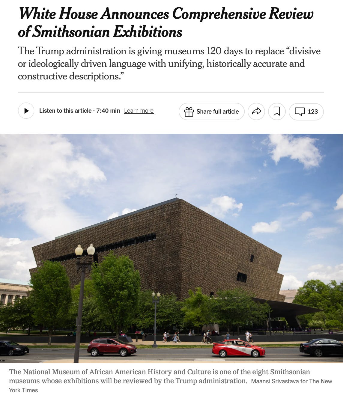 Earlier this summer, Kim Sajet, the longtime director of the National Portrait Gallery, resigned after Trump tried to fire her (though the Smithsonian Board of Regents asserted he did not have that authority). Sajet said of her time at the Smithsonian, “Together, we have worked to tell a fuller, more American story — one that fosters connection, reflection and understanding.”2 (WE LOVE YOU, KIM!)