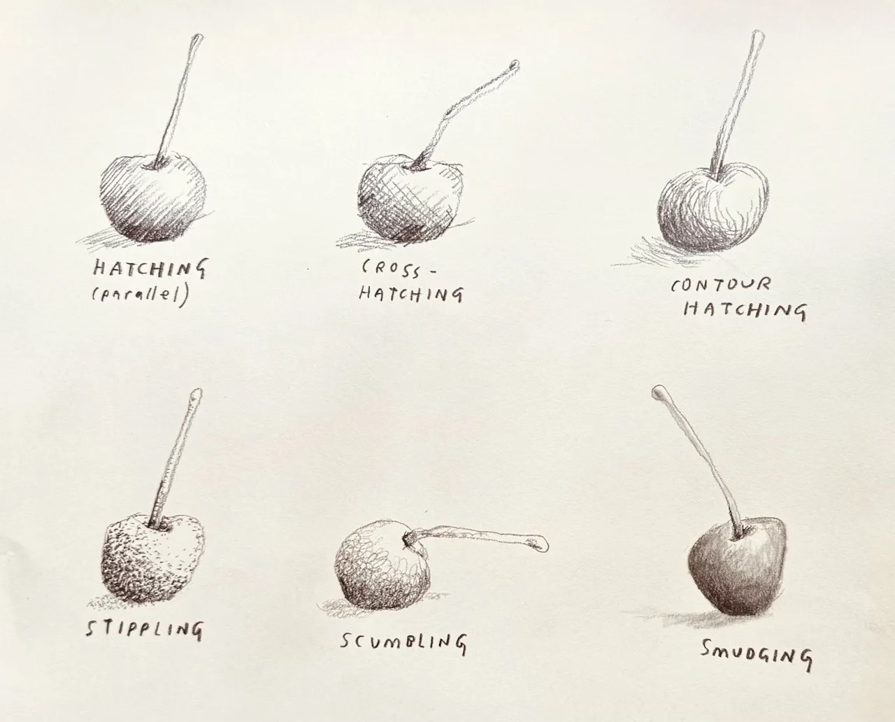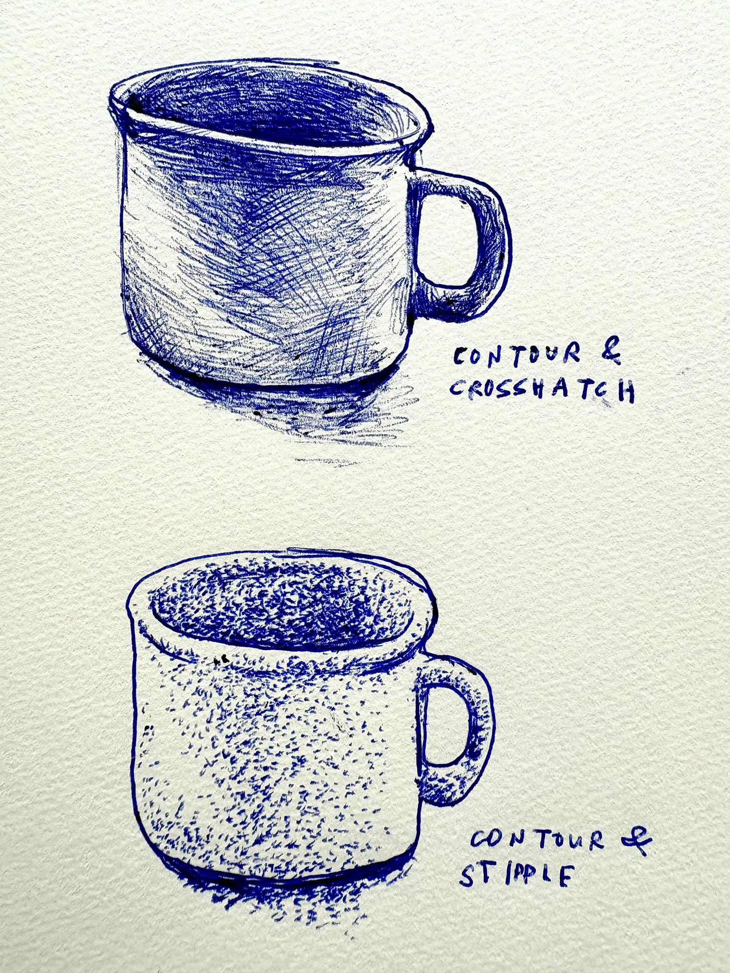 We can apply it to the ballpoint pen, too. You can layer marks to build value, including hatch marks (in any direction, parallel, cross, or contour, stippling (dots) and scumbling (scribbling). Smudging? Not so much, but hey, give it a try and report back!