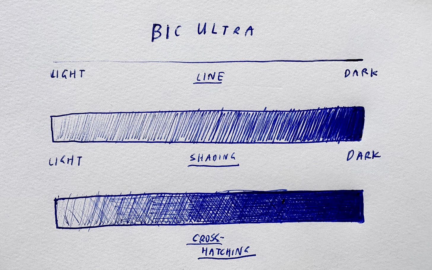 In some ways, the ballpoint pen is more like a pencil than other pens are: you can control the amount of ink that comes out of the pen with pressure. Less pressure = lighter line. More pressure = darker line.