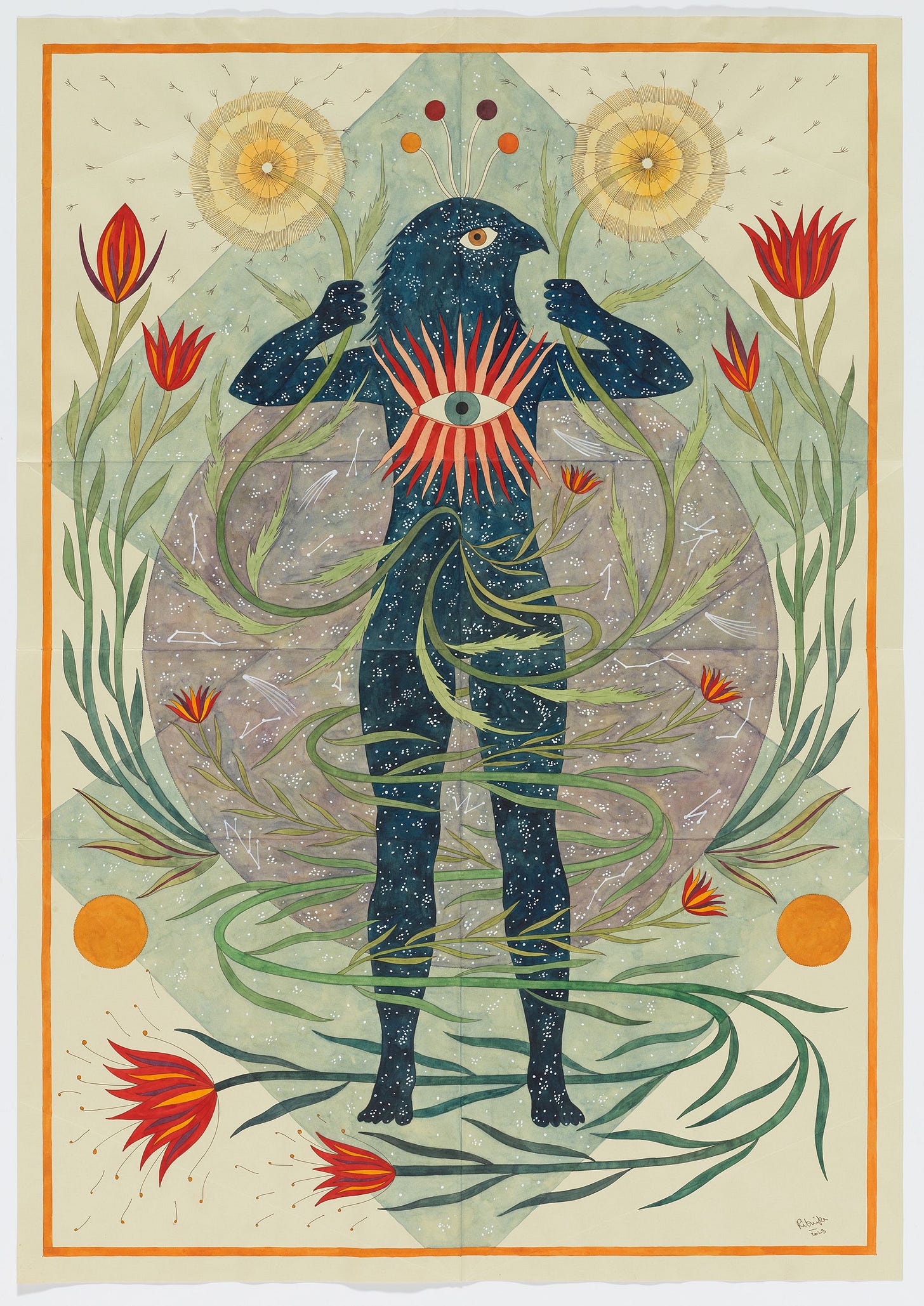 Rithika Merchant, India b.1986 / The Pollinator 2023 / Gouache, watercolour and ink on paper / 100 × 70cm / Courtesy: The artist and TARQ, Mumbai. Image via Queensland Art Gallery. Suggested by Jenny.