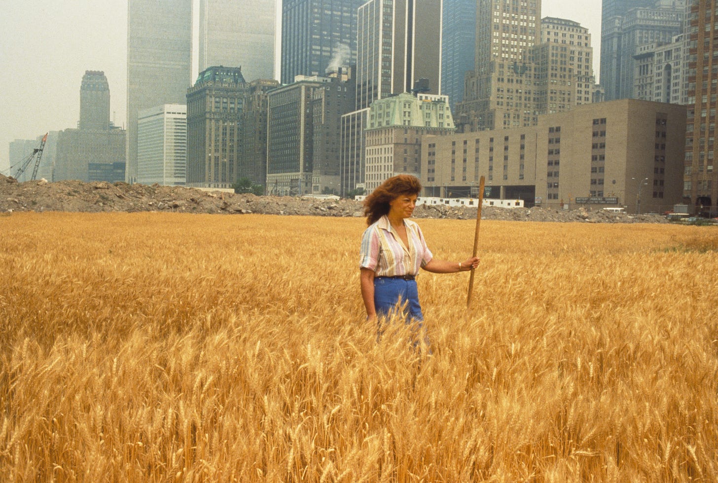 Agnes Denes, Wheatfield – A Confrontation, Battery Park Landfill, Downtown Manhattan – With Agnes Denes Standing in the Field, 1982 Photo credit: John McGrail. Courtesy Leslie Tonkonow Artworks + Projects, New York. Image via Harvard Graduate School of Design. Suggested by Joi.