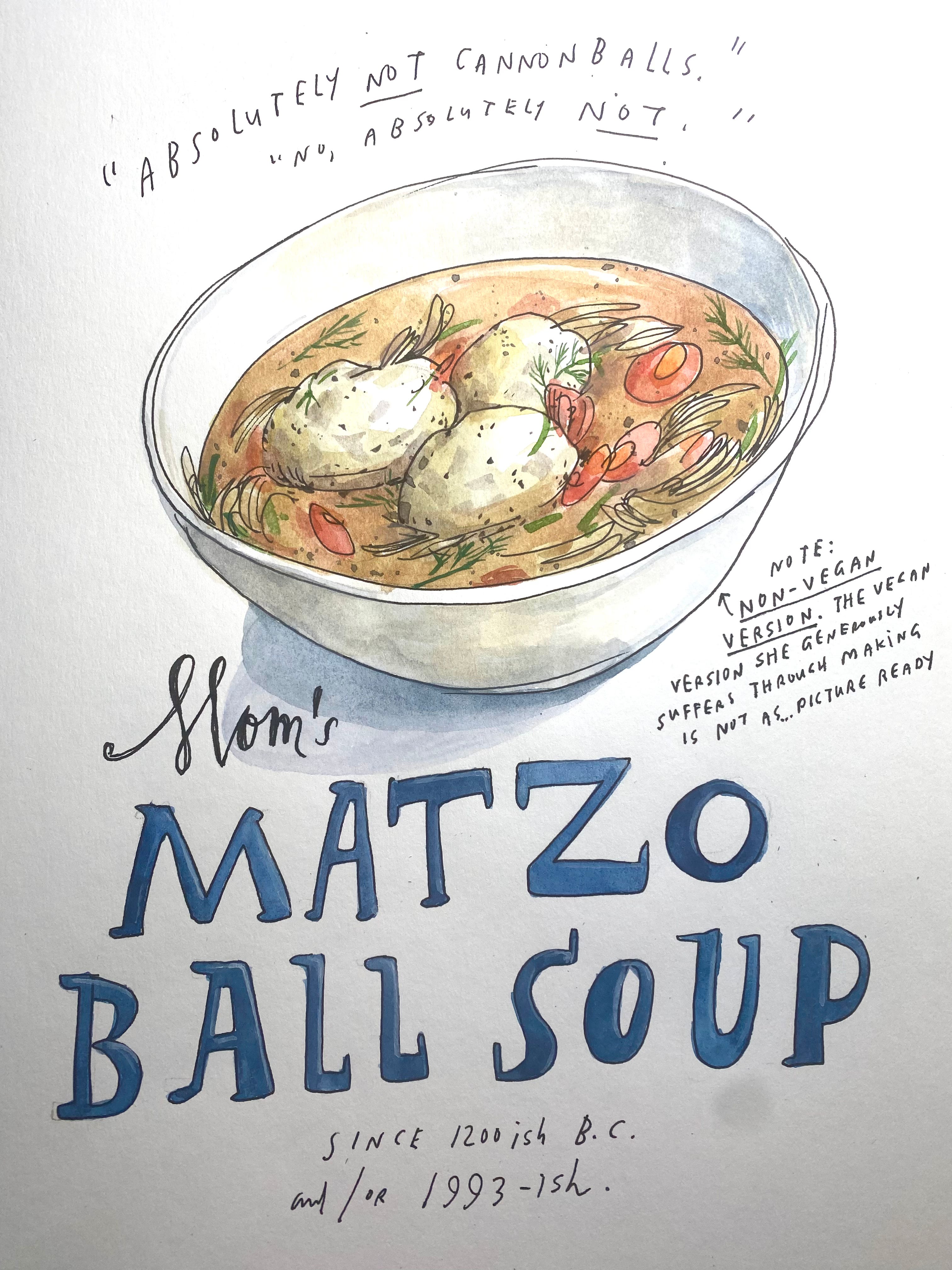 Here’s mine - a quickie done from memory! Mom’s Not-Cannonball Matzo Ball Soup. My mom is Jewish and my Dad is Episcopalian, but I was raised secular, which makes me a culturally Jewish Atheist. Which means my religion is Mini-Eggs. Ha!