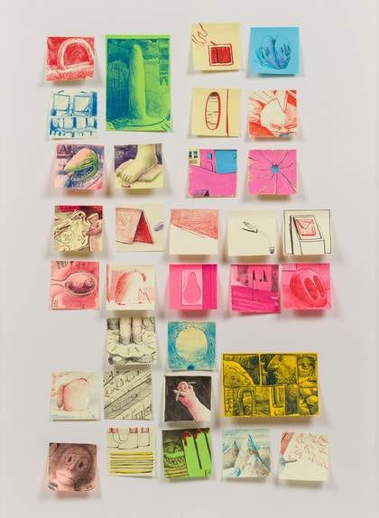 English artist Ed Atkins mostly works in computer-generated animations and videos. But in 2020, during the pandemic, he turned to Post-its as a convenient canvas for daily drawings that he included in his daughter’s lunchbox. He described them as “a way for me to achieve something every day.”